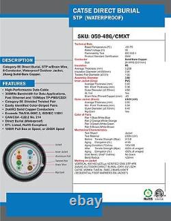 Cat 5e CMXT 350 Mhz F/UTP Direct Burial 1000 feet Outdoor cable Overall Shielded twisted pair F/UTP with dual jacket as water block barrier 24 awg wires made of solid Bare copper conductors ETL type CMX for weather and water proof outdoor network installations UV resistant Jacket with Sequential Length Markings Vertical Cable 059-486/CMXT.